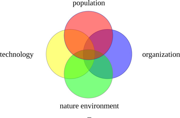 Finally, as the socio-ecological theories, approaches and methods are developed, social atomism is substituted with organizational functionalism; attention is focused more on the functioning of a social organization rather than on the driving forces and causes of this process or space-temporal forms of its manifestation. A description of this mechanism was made by Otis Dudley Duncan (1921—2004) and Leo Francis Schnore, who used the socio-ecological complex theory. The socio-ecological complex comprises four components: