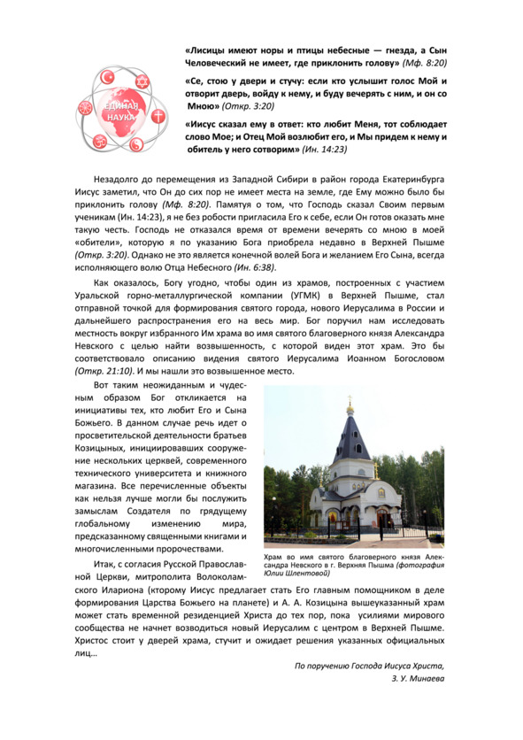 (5) Козицын Андрей Анатольевич, генеральный директор Уральской горно-металлургической компании и УГМК-холдинга; Господь высоко оценил объекты в районе города Екатеринбурга, избранного Богом в качестве духовной столицы России (см. параграф 6), построенные с участием УГМК, отметив, что они как нельзя лучше подходят для целей данного проекта;
