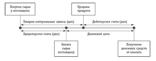 Оборотный капитал, в особенности дебиторские и кредиторские счета, а также товарно-материальные запасы, является важнейшей частью капитала производственных, торговых (опт и розница) и распределительных (дистрибутивных) компаний. Один из показателей эффективности управления оборотным капиталом – денежный цикл – рассчитывается по следующей формуле: период, в течение которого капитал связан в товарно-материальных запасах, плюс время, за которое денежные средства от продажи поступают на дебиторские счета, минус срок, в течение которого происходит оплата материалов поставщика по кредиторским счетам. Теория расчета проста (см. рис. 3.1). Компания покупает материалы или продукты (а компании-производители оплачивают также труд работников и несут иные затраты, связанные с производством готового продукта). Продолжительность времени от момента покупки материалов до момента продажи готового продукта – это период, в течение которого капитал связан в виде товарно-материальных ценностей. Из этой величины нужно вычесть срок оплаты покупки (период оплаты по кредиторским счетам). Период поступления средств от продажи на дебиторские счета измеряется от момента совершения сделки до получения денежных средств от клиента. Таким образом, денежный цикл представляет собой время, необходимое компании для того, чтобы возместить денежные средства, истраченные на покупку материалов, денежными средствами, вырученными от продаж. Некоторые предприятия работают с отрицательным денежным циклом, оплачивая услуги поставщиков после оплаты счетов клиентами. В результате, оперативно собирая выручку от продаж и договорившись о выгодных условиях с поставщиками, они получают, а не изымают капитал из ежедневного производственного цикла. И хотя для многих компаний очень сложно, если вообще возможно, работать с нулевым или отрицательным денежным циклом, его сокращение может быть отличной целью для увеличения эффективности оборотного капитала.
