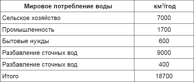 Ежегодный объем воды, который может использовать человечество, составляет 37,3 тыс. км3 (речной сток) и часть подземных вод, запасы которых – 13 тыс. км3. Сами по себе эти цифры ничего не говорят, кроме того, что это большие величины. Для их оценки необходимо сравнить их с потребностью человечества в воде. Из имеющихся данных по расходу воды (в км3) на 1975 год [5] видно, что потребности уже сравнимы с природными запасами.