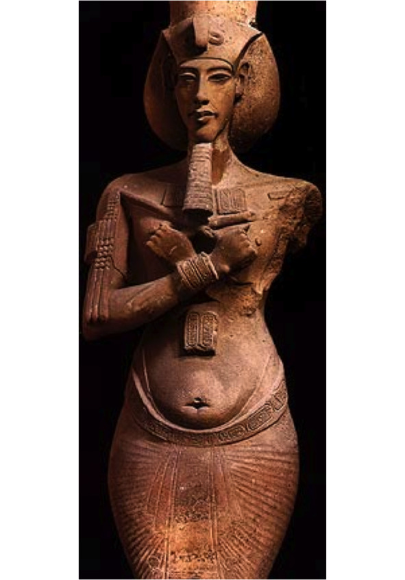Перед нами живой человек, со всеми особенностями его внешнего облика. Во-первых, лицо – просто лошадиная морда какая-то! Но чем больше вглядываешься, тем труднее от него оторваться. Узкие, монголоведные глаза, высокие щеки, длинный нос, мощный набалдашник подбородка, выпяченные, резные губы, и все сработано так гениально, что кажется, будто он сейчас с тобой заговорит! Далее, его фигура: Эхнатон – явный гермафродит! У него женская грудь, широкие бедра, затянутый жирком животик. И какая-то изнеженность во всех его движениях и жестах. И его жена Нефертити – ему под стать. Её скульптурный бюст с одним глазом без зрачка – вершина зодчества, непревзойденная доселе…