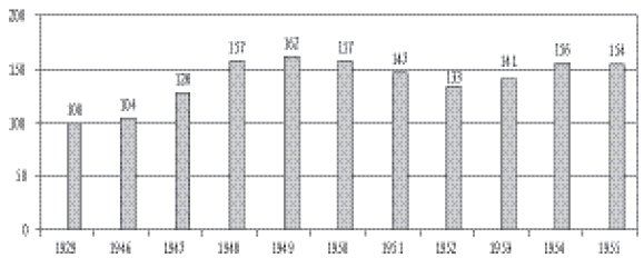 Перепады хозяйственной конъюнктуры ставили под угрозу осуществление основных политических и социальных планов перонистского руководства. Но на первом этапе своего правления перонистам удалось ощутимо улучшить материальное положение широких слоев аргентинского населения и тем самым повысить свой авторитет. Краеугольным камнем социальной политики Х.Д. Перона было последовательное укрепление позиций преданных лично ему профсоюзов и националистически настроенной части предпринимательского класса. Широко используя накопленные в период войны и в первые послевоенные годы значительные финансовые ресурсы, перонистское правительство провело существенное повышение реальной заработной платы (см. рис. 1.2) и создало развитую систему социального обеспечения, которая ориентировалась на европейские образцы и на тот момент была, безусловно, лучшей в Латинской Америке. Отсюда – глубоко укоренившееся в обществе мнение, что во времена правления Х.Д. Перона «Аргентина была праздником».
