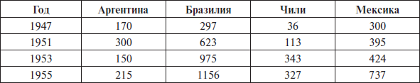 Не сработали планы подъема металлургической промышленности, в результате чего страна в этой отрасли отстала от других латиноамериканских государств (см. табл. 1.9). Причин такого положения дел было несколько: слабая сырьевая база, нехватка валюты для закупки дорогостоящего оборудования, бюрократические барьеры и проволочки. Но факт остается фактом: при первом перонистском правлении металлургическая основа аргентинской промышленности создана не была. А без этого многие другие проекты повисали в воздухе.