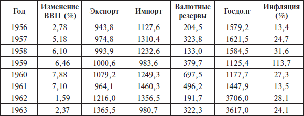Кроме того, режим провел резкую девальвацию песо (его цена за 1 доллар США снизилась с 8,8 до 22 единиц) и внес коррективы в фискальную политику, отвечавшие интересам наиболее обеспеченных слоев населения. В итоге были практически перечеркнуты результаты, достигнутые перонистским правительством в деле перераспределения национального дохода в пользу наемных работников: их доля снова ощутимо снизилась, составив в 1957 г. 42 %71. В целом макроэкономические результаты правления военного режима были весьма скромными (см. табл. 1.10). В 1955–1957 гг. ВВП демонстрировал умеренный рост, сальдо внешнеторгового баланса оставалось отрицательным, увеличивался госдолг, набирала темпы инфляция.