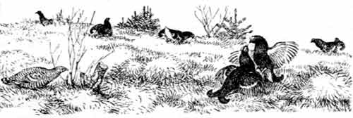 Групповое, т. е. практически хоровое исполнение видовой песни, присуще меньшему числу видов птиц, чем обычная индивидуальная вокализация. Групповое пение на токах весной наиболее характерно для тетеревов и дупелей. И если токовое пение дупелей слышал далеко не каждый орнитолог, то «бормочущие» звуки тетеревиного тока знает большинство охотников. Эти, казалось бы, негромкие булькающе-воркующие звуки, сливаясь в общий хор сплошного гулкого бормотанья, далеко, на несколько километров, разносятся по утреннему весеннему лесу. На этот радостный лесной гул с равным вожделением слетаются и подкрадываются и тетерки, и охотники.