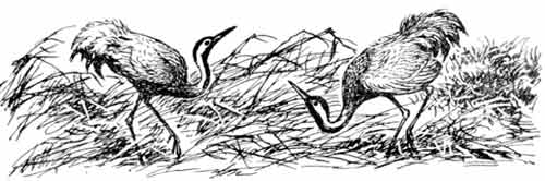 Лихо танцуют все виды журавлей – и пока ещё многочисленный серый журавль, и очень редкие, внесённые в Красные книги, японский и белый журавль (или стерх). Весенние пляски свойственны также и замечательному африканскому венценосному журавлю с золотисто-жёлтой короной над чёрным лбом, и журавлю-красавке. Этот последний, обитающий у нас в стране в сухих степях, солончаках, а иногда и на пастбищах довольно близко к поселениям человека, очень красив и грациозен. Сизо-серая спина, блестяще-чёрные голова и шея, большие белые пучки перьев, тянущиеся от глаз по бокам затылка и темно-красные глаза – прекрасное сочетание для птицы с горделивой осанкой на фоне красно-бурых степных просторов. Красавки собираются на свои весенние танцы большими сплочёнными группами, иногда образуя круг, в середине которого пляшут самые заядлые танцоры, издающие громкие призывные крики. Птицы явно веселятся, грациозно взмахивая крыльями, приседая, и иногда подбрасывая вверх сорванные растения.