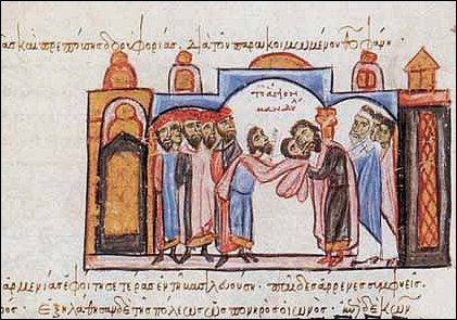 A miniature painting of the Skilitzis Code, a Byzantine manuscript produced between the 11th and 13th century, and currently kept at the Madrid National Library, shows the handover of the mandylion to the Emperor Romanus I Lecapenus (sided by the Patriarch of Constantinople Theophylact and dignitaries). In the middle of the picture below, it is clearly visible the almost three-dimensional image of Christ rising from the cloth: