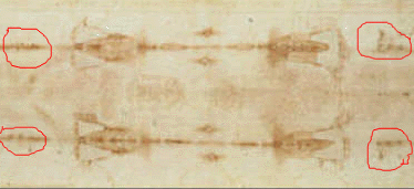 A detail of the Shroud with highlighting of the four groups of the oldest burns