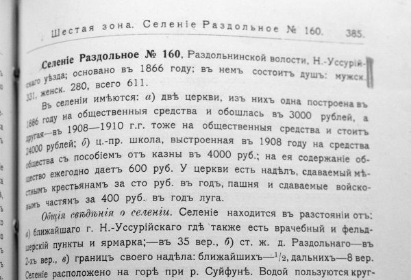 «Селение Раздольное № 160, Раздольнинской волости, Н.-Уссурийского уезда; основано в 1866 году; в нем состоит душ: мужск. 331, женск. 280, всего 611.