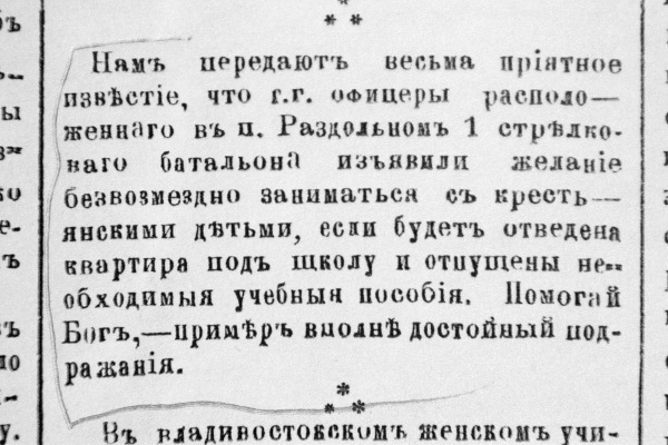 «Нам передают весьма приятное известие, что г. г. офицеры расположенного в п. Раздольном 1 стрелкового батальона изъявили желание безвозмездно заниматься с крестьянскими детьми, если будет отведена квартира под школу и отпущены необходимые учебные пособия. Помогай Бог – пример, вполне достойный подражания» (газета «Владивосток» № 36 от 7 сентября 1886 г. С. 6).