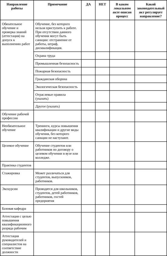 Давайте и мы разложим по полочкам всё, что делает учебный центр или отдельный специалист по обучению. Выясним, какие направления в работе, сгруппируем их по общим признакам и обязательно укажем, в каких локальных актах описаны все процедуры и порядок. В приложение к этому уроку я подготовила для вас чек-лист, который поможет быстро сориентироваться при знакомстве с системой обучения, действующей на предприятии. Поставьте в нем галочки «да» или «нет», если указанное направление входит в ваш функционал. Напишите регламенты, регулирующие процесс.