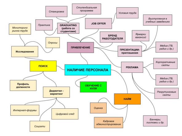 В целом всю работу службы персонала можно свести к двум задачам: чтобы был персонал и чтобы все продуктивно работали. Об этом прекрасно написали мои коллеги – Виктория Шарапова и Руслан Усеев – в своей статье «HRM и бизнес: танец вдвоем».2 А я на основании их статьи нарисовала майнд-карту эйчар-процессов (рисунки 1—3), которой и поделюсь с вами. Вы можете ее улучшить или нарисовать свою. Я разделила майнд-карту на три рисунка из-за того, что в книге невозможно разместить ее в полном (едином) виде.