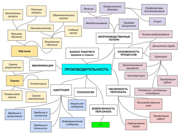 Как использовать майнд-карту для своей работы? Карта помогает выбрать направления, которые в текущий момент наиболее важны для развития предприятия. Можно даже заварить коктейль из инструментов разных областей: обучение + мотивация, обучение + коммуникация и так далее. И когда мы видим на карте, на какие цели работают отдельные мероприятия внутреннего учебного центра (специалиста по обучению), то становится отчетливее главное отличие внутренней системы развития персонала от внешних учебных центров. Внешние образовательные центры сфокусированы только на процессе обучения. Они не ставят перед собой задачу решить проблемы текучести, адаптивности персонала, не работают на привлечение и удержание. Поэтому чтобы встроить обучение персонала в процессы компании ответьте на вопрос: какая стратегическая задача на текущем этапе стоит перед вашей эйчар-службой – подбор персонала или производительность труда? Выберите элементы на майнд-карте, которые помогут в достижении этих задач. Составьте план и двигайтесь в этих направлениях.
