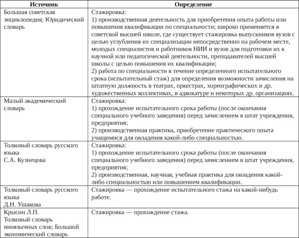 Козачек А. В. и Краснова А. В. отмечают: «Стажировка – это программа, направленная на приобретение практического опыта и освоение выбранной специальности в реальной обстановке. В других источниках под стажировкой понимается производственная практика с временным трудоустройством студентов»9.
