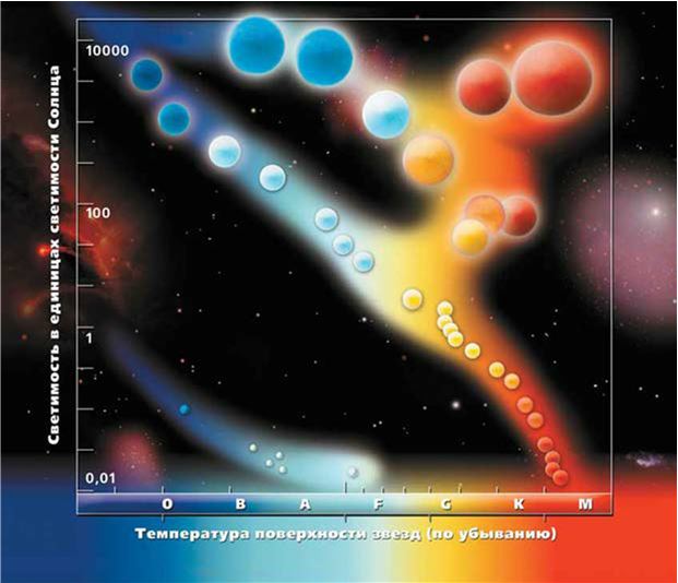 Рис. 1.1. «Жизненный путь» звезд – по мере старения звезда обнаруживается в различных точках изображенной на рисунке диаграммы Герпштрунга – Рассела, чаще всего движение идет по «главной последовательности» – линии точек, идущей из верхнего левого угла диаграммы в нижний правый.