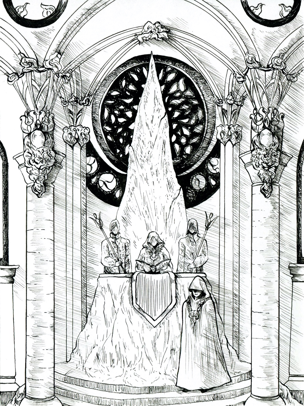 В конце зала была огромная пика из белоснежного переливающегося камня. Он весь сверкал в свете, что падал на него из ажурных витражных окон. Под пикой находилось плато из такого же камня. На нём стоял мужчина в длинном белом одеяние и держал в руке книгу. По обе стороны от него располагались ещё двое, но в серых одеждах. У подножия алтаря был, по всей вероятности, мой будущий муж, одетый в белую рясу в пол. На его голове был капюшон, который полностью закрывал лицо. Видны только губы и волевой подбородок. Подойдя ближе, я так и не смогла разглядеть мужчину. Мда, я даже не увижу за кого выхожу замуж…