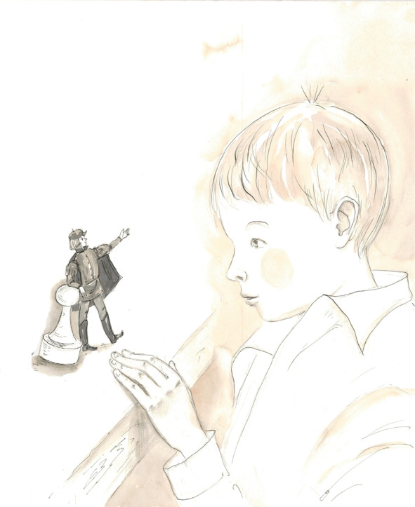 И вот однажды, рассматривая в очередной раз банку, Маленький папа снял красивую, круглую, всю в золоченом орнаменте крышку и увидел, как поверх груды шахматных фигур зашевелилась фигурка деревянного черного коня. Под ним медленно образовалась небольшая темная щель – как будто кто-то с усилием раздвигал мешающие ему фигурки – и из этой щели, чернея, показался еще более темный, маленький человечек. Он был почти весь черный, на нем была круглая черная шапка с маленькой пупочкой на самой макушке, короткий черный плащик, и тугие черные штаны, заправленные в сапоги до колен.