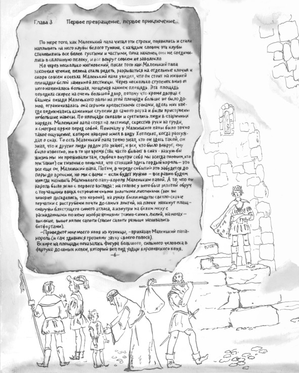 Маленький папа стоял на лестнице, скрестив руки на груди, и смотрел прямо перед собой. Поначалу у Маленького папы было точно такое ощущение, которое, наверно, имел в виду Хотпехот, когда рассуждал о снах. То есть Маленький папа точно знал, кто он здесь такой, он знал, что и другие люди рядом это знают, и все, что было вокруг, ему было известно, но в то же время (так часто бывает в снах – какую бы жизнь мы не проживали там, в этих сновидениях, глубоко внутри себя мы всегда помним, кто мы такие) он тихонько понимал, что стоящий здесь гордый король – это все еще он, Маленький папа.