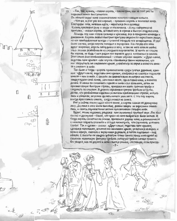 Так и сделал – сказал: «Друг-сокол, подставь свое крыло», сделался маленьким, вскочил на соколиное крыло, ухватился за перья, и взмыл наверх, сначала к верхушкам деревьев, а потом еще выше – под облака. С высоты он увидел зубчатую стену своего замка и на одной из башенок маленькую фигурку трубача, который трубил сигнал тревоги.
