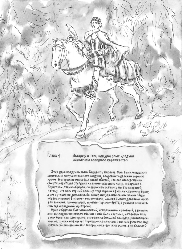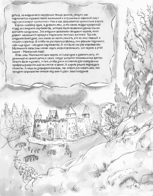 Итак, наш Маленький папа-король остался один в далеком лесу, отделенный от своего замка и своих солдат внезапно появившимся врагом. Нечего было и думать, о том, чтобы днем незаметно для осаждавших пробраться верхом или на соколе в замок. И король решил подождать темноты. А пока он дожидается вечера, мы можем рассказать вам, как соседнее королевство попало под власть двух злых колдунов.