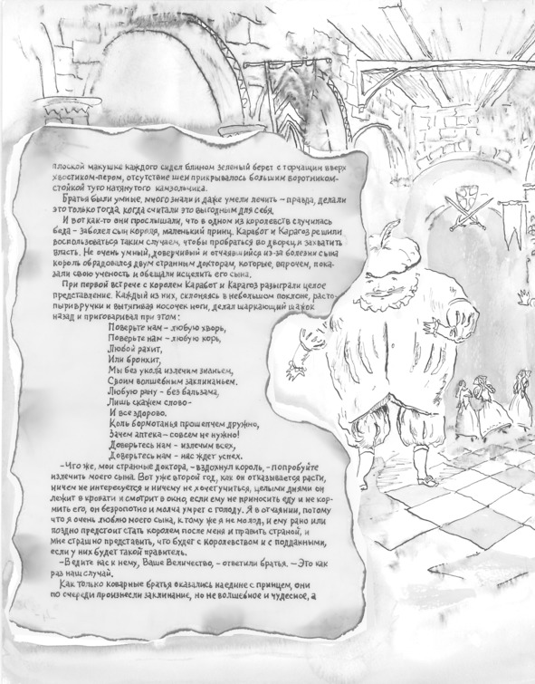 Поверьте нам – любую хворь,Поверьте нам – любую корь,Любой рахит,Или бронхит,Мы без укола излечим знаньем,Своим волшебным заклинаньем.Любую рану – без бальзама,Лишь скажем слово —И все здорово.Коль бормотанья прошепчем дружно,Зачем аптека – совсем не нужно!Доверьтесь нам – излечим всех,Доверьтесь нам – нас ждет успех.– Что же, мои странные доктора, – вздохнул король, – попробуйте излечить моего сына. Вот уже второй год, как он отказывается расти, ничем не интересуется и ничему не хочет учиться, целыми днями он лежит в кровати и смотрит в окно, если ему не приносить еду и не кормить его, он безропотно и молча умрет с голоду. Я в отчаянии, потому что я очень люблю моего сына, к тому же я не молод, и ему рано или поздно предстоит стать королем после меня и править страной, и мне страшно представить, что будет с королевством и с подданными, если у них будет такой правитель.