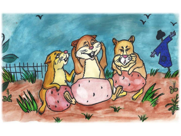 Сидит зайка, по сторонам оглядывается. А морковка так и манит его, так и просит ее попробовать…. Вдруг слышит зайка шорох в картофельных рядах. Робко сделал он несколько прыжков и видит, как хомяки картошку из земли подрывают, да картофелины к себе в нору катят.