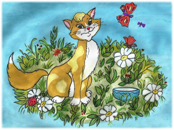 Бабушка выпустила корову за ограду, где ее ждали чудовища-подружки, и понесла тяжелое ведерко домой. Как же велико было удивление зайки, когда на дорожке он чуть не столкнулся с еще одним неведомым зверем: маленькое пушистое чудо мурлыкало и терлось о бабушкины ноги, мешая ей переступать. Зверек был очень пестрой окраски: рыжая шерстка с серыми пятнами, белая мордочка и лапки! Зайка никогда в жизни не встречал никого похожего в лесу. Ни белки, ни бурундуки не походили на этого обладателя пушистого хвостика, так изящно извивающегося между ногами бабушки.