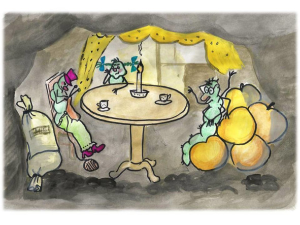 Гусеницы рассмеялись и, махнув своими короткими лапками на зайца, продолжили свою трапезу. Зайке стало обидно: неужели нет никакого способа справиться с этими вредителями?! Но тут зайку осенила замечательная мысль. Он упрыгал к краю огорода, где росли небольшие кустарнички бузины, и стал собирать небольшие прутики. Гусеницы победно улюлюкали ему вслед, выкрикивали оскорбления, показывали языки и строили рожицы. Но их удивлению не было конца, когда перед ними возник воинственный заяц, вооруженный веником из прутьев.