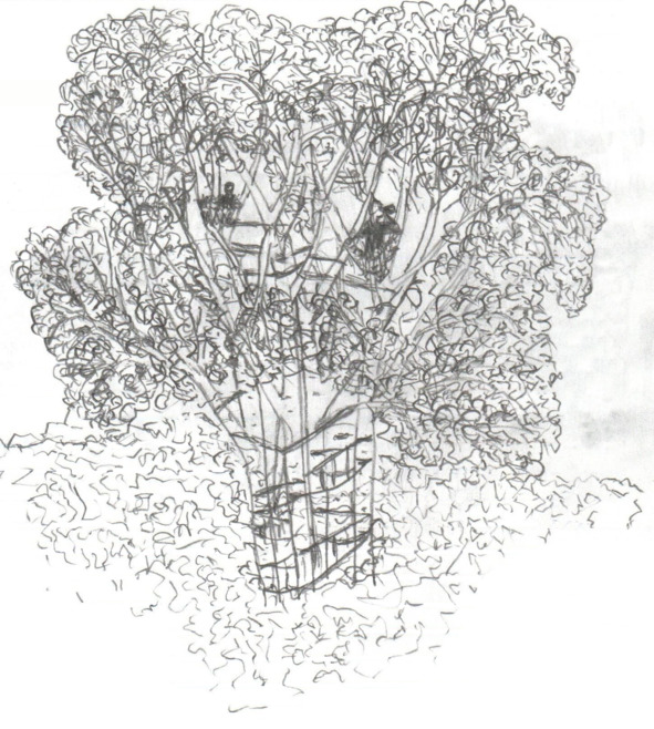 Хвойный лес относится к первому ярусу наряду с березой, дубом, тополем. Если дубы и березы стоят небольшими группами или одинокими мачтами, то тополя и хвойные разделились на сплоченные команды, образовав три смотровых пункта и, собственно, ельник. Ко второму ярусу леса относятся малые деревья и кустарники – клен, липа, рябина, яблоня, орешник. Третий ярус образуют подлесок и трава, четвертый – самая низкая растительность леса – мхи и напочвенный покров.