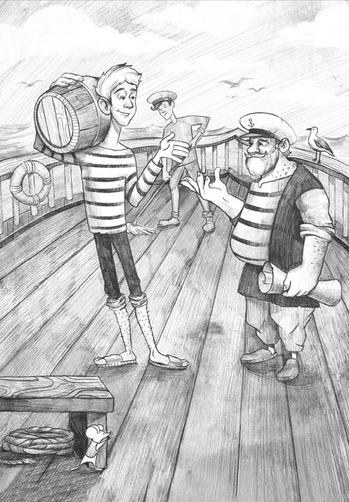 Маленький Бартоломью испугался и громко запищал. На его писк сбежались корабельные мыши, которых всегда полно в любом трюме с продуктами. Они пожалели беднягу и решили о нем позаботиться. Когда Бартоломью немного освоился, мыши отвели его на палубу, откуда был виден безбрежный синий океан. Там было гораздо интереснее, чем в мрачном трюме. Мышонок облюбовал укромное местечко недалеко от капитанского мостика и часто сидел там, глядя на волны и наблюдая за тем, что происходит вокруг. Он смотрел, как мимо пробегали огромные матросы, которые все время куда-то спешили и что-то кричали. Иногда они мыли палубу и однажды случайно чуть не прихлопнули Бартоломью шваброй. Он успел увернуться, но с тех пор каждый раз, завидев человека в тельняшке, драящего пол, быстро убегал в трюм. Иногда мимо проходил капитан. Он был не таким огромным, как матросы, он не кричал, но его все слушались. Было видно, что капитан – самый главный и что здесь командует именно он. «Я тоже хочу стать капитаном! Управлять кораблем – это так здорово!» – думал Бартоломью. А еще он мечтал о том, как приплывет в далекую незнакомую страну и отправится по ней путешествовать.