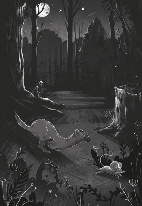 Мышата крепко спали и не видели, как рядом с их убежищем появился хорек Ерофей. «Хм, пахнет мышами, – подумал он. – Похоже, я смогу хорошенько позавтракать!» Ерофей начал вынюхивать следы мышат. «Кажется, они где-то совсем рядом. Сейчас я их сцапаю!» – радовался злодей. Он добрался до гнездышка, где спали малыши, и начал раскидывать траву, закрывавшую вход. Услышав шорох, Бартоломью проснулся и быстро вскочил – и очень вовремя! Прямо на него глядели желтые глаза невиданного зверя. Бартоломью понял, что надо спасаться самому и спасать крепко спящую Матильду.
