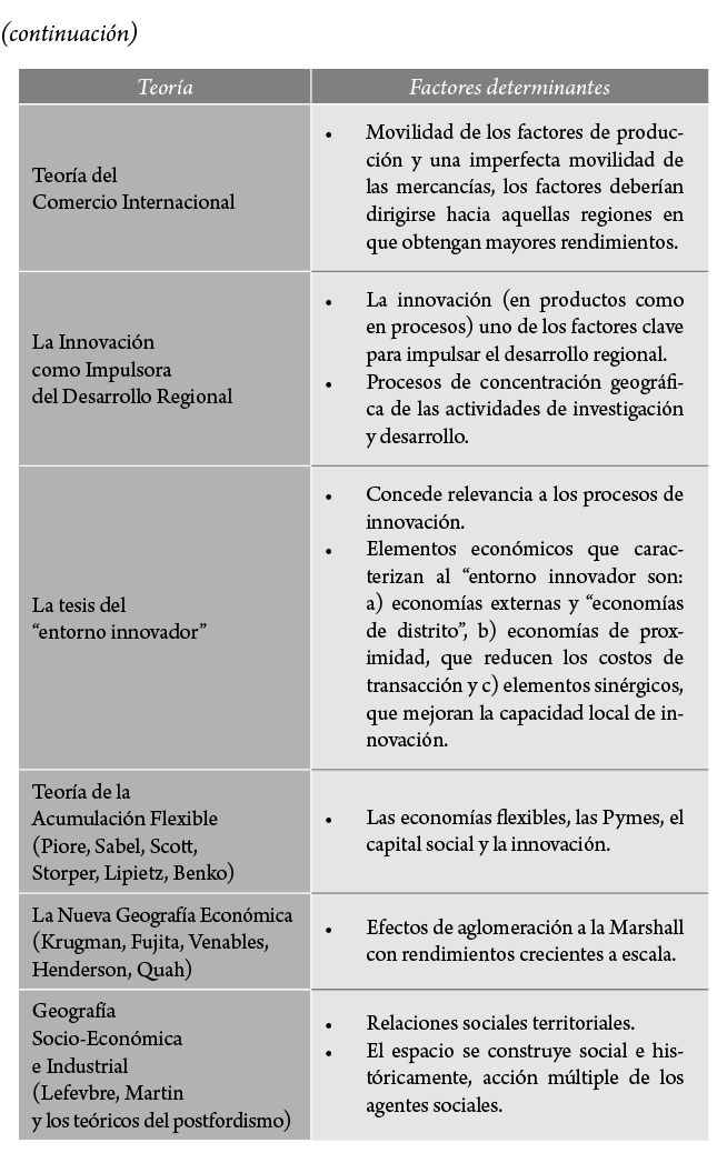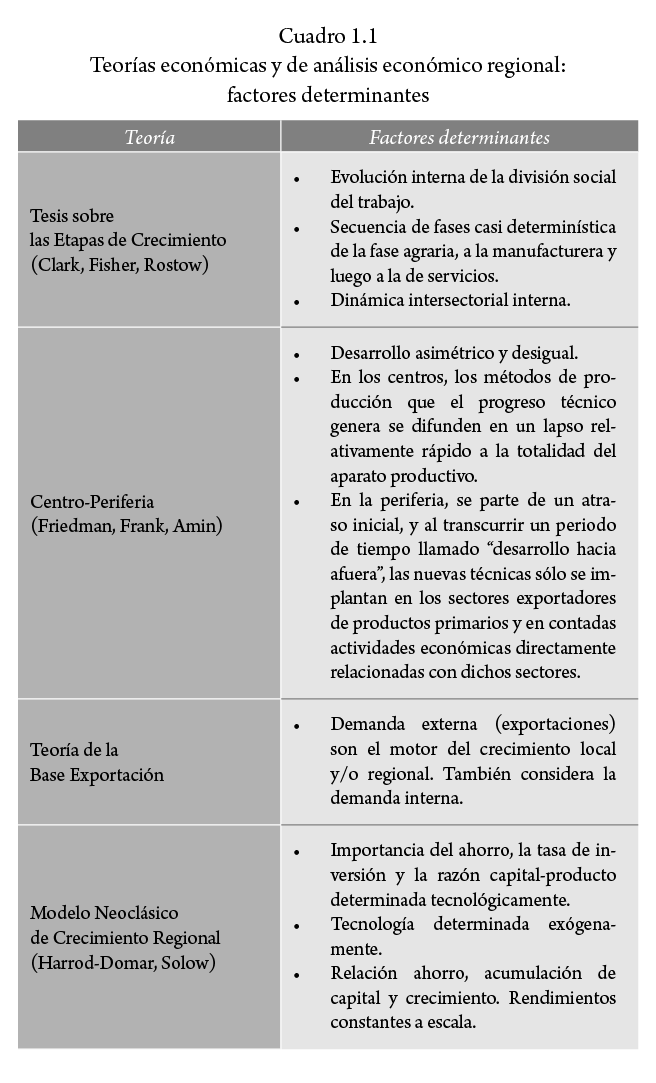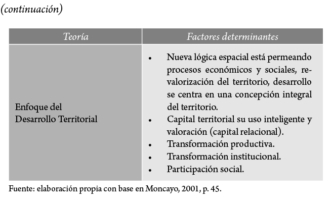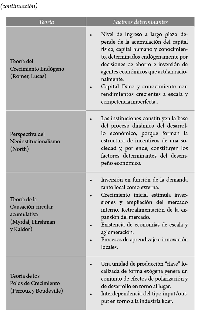 A continuación, en el cuadro 1.1 se presenta un resumen de las teorías económicas y de los factores que consideran determinantes para el crecimiento económico, para posteriormente profundizar en el Enfoque del Desarrollo Territorial.