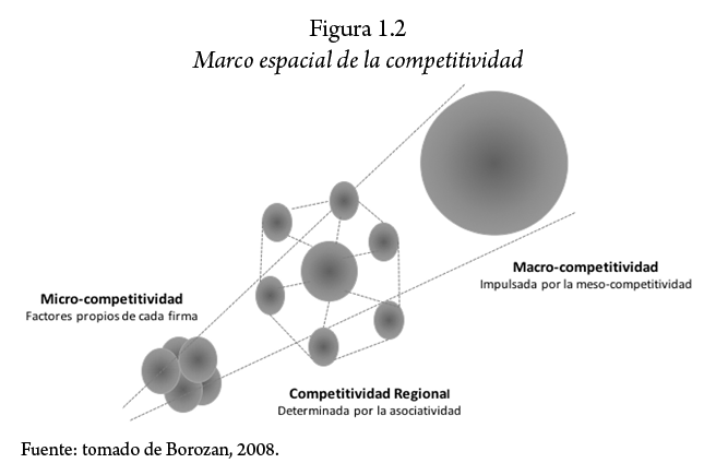 De manera general, el análisis de la competitividad se hace en tres niveles: el micro, el meso y el macro. Desde la dimensión micro se analiza la competitividad entre las empresas que hay en una nación o región; la dimensión meso se refiere a la industria y la región, mientras que la dimensión macro analiza la competitividad entre las naciones (Cellini y Soci, 2002) (Ver figura 1.2).