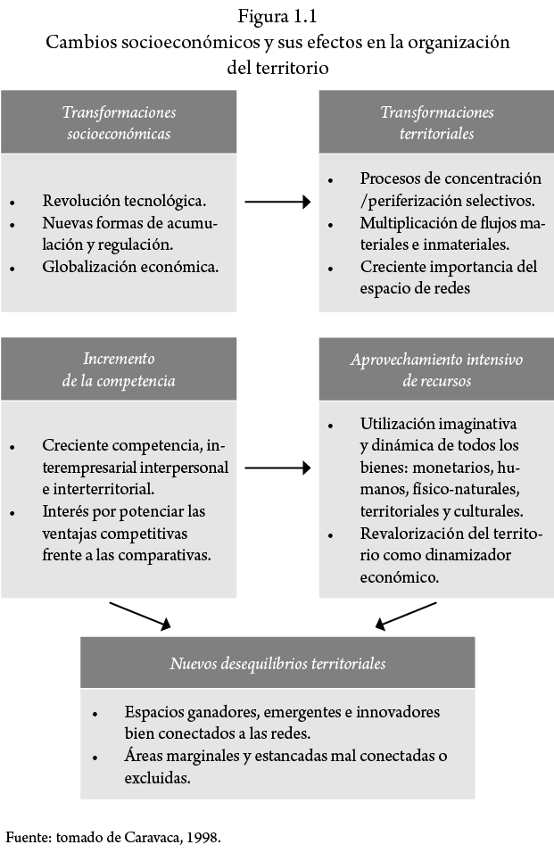 Es por ello, que los territorios buscan incorporarse en una buena posición, revalorizando todos sus bienes patrimoniales e identificando aquellos recursos que les confieran ventajas competitivas y con ello lograr una buena posición en la economía global. Incorporarse de manera competitiva en el mercado global implica desarrollar una capacidad innovadora que les permita aprovechar y utilizar de manera imaginativa, racional y equilibrada sus recursos locales en aras de su desarrollo (Caravaca, 1998, p. 6) (Ver figura 1.1).