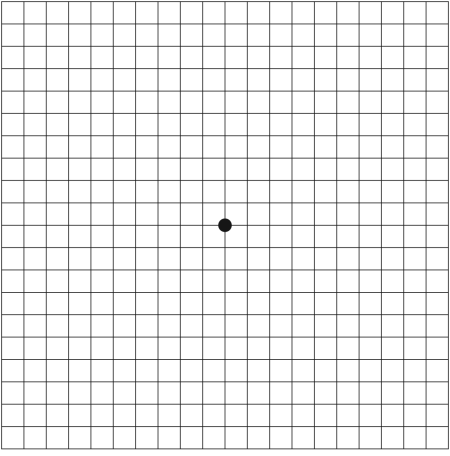 Если вы обычно носите очки, наденьте их. Прикройте один глаз и пристально посмотрите на центральную точку с расстояния вытянутой руки. Затем, продолжая без отрыва смотреть на центральную точку, медленно приблизьте листок к лицу на расстояние 30–20 сантиметров от глаз. Во время приближения взгляд от этой точки не отрывайте. Если вы заметите где-либо на листке изменения формы сетки – какие-то искривления, искажения, прерывистость линий, выпадение участков линий или затуманенность, отметьте эту зону прямо на листочке. Повторите тест и обведите патологическую зону карандашом.