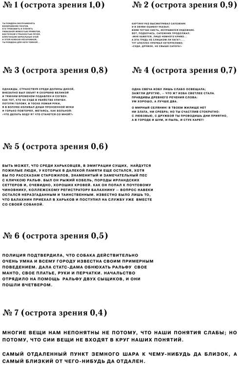 Упражнение 1. Из приведенных ниже отрывков определите самый мелкий шрифт, который можете читать свободно, без усилий на расстоянии 20–30 см (рис. 9, 10).
