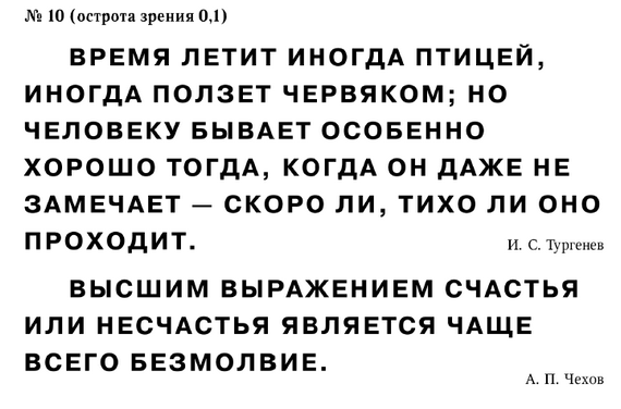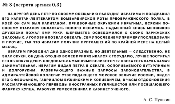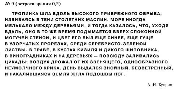 Упражнение 2. Выберите из приведенных выше отрывков самый мелкий шрифт, который можете читать свободно, без усилий на расстоянии 20–30 см. Если возникла необходимость читать с очками, то первоначально можете воспользоваться ими. Через некоторое время, когда зрение улучшится, надо будет снимать очки во время чтения. Если вы испытываете неприятные ощущения при чтении мелкого шрифта, немедленно прекратите упражнение. Дискомфорт свидетельствует о наличии напряжения, то есть о неправильном использовании вами своих глаз. В следующий раз начните читать более крупный шрифт. Текст читать 10–15 минут на расстоянии 20–30 см. Постепенно вы сможете читать без усилий все более мелкий шрифт. Время чтения, если вы не испытываете напряжения глаз, можно увеличить до 20–30 минут. Упражнение особенно рекомендуется близоруким.