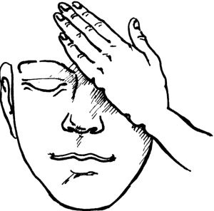 Исходное положение: сидя в удобной позе, выпрямите пальцы левой руки и положите ее ладонью на закрытый левый глаз. Локоть несколько отведен влево, пальцы лежат на лбу и немного повернуты вправо (рис. 7).