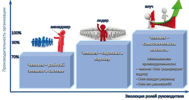 В современном мире успешный руководитель выполняет несколько взаимосвязанных и дополняющих друг друга ролей. Исторически роли развивались и усложнялись, постепенно включая в себя все более «тонкие» уровни управления, двигаясь от регулярного менеджмента к лидерству и коучингу. Развитие шло по пути поиска средств и методов воздействия на человека с целью повышения эффективности его работы.