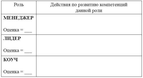 По шкале от 0 до 10 оцените, пожалуйста, свой уровень по каждой из ролей руководителя и запишите шаги, которые вы могли бы предпринять, чтобы развивать свой профессионализм.