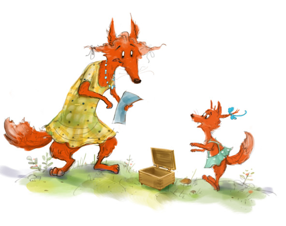 – «Дорогой папа! – громко читала мама-лиса. – Попроси маму не жадничать. Она не даёт мне пользоваться своими вещами. А ведь я уже взрослая. И мне так к лицу мамин гребень!»