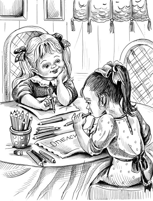 И Тамарочка сбегала в папину комнату и принесла чернила и перо. И стала писать. А писать она хоть и умела, да не очень. Стала перо в бутылку окунать и опрокинула бутылку. И все чернила на скатерть вылились. А скатерть была чистая, белая, только что постланная.