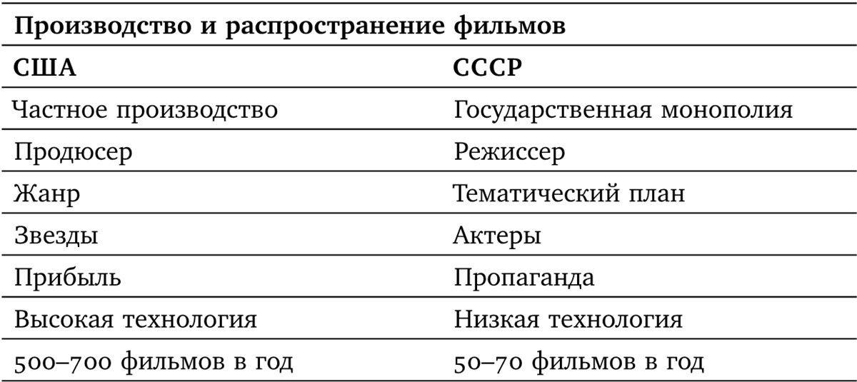 В этой таблице, составленной Майей43, перечислены параметры, по которым можно сравнивать кинопроизводство в двух странах. Разница между частным производством и государственной монополией очевидна и не требует пояснений. Столь же очевидна разница в уровне технологии и количестве фильмов. Но пара продюсер–режиссер нуждается в комментариях. В России, как заметила Майя, все кино авторское44, «никто не говорит: это фильмы Мосфильма, или это фильмы Ленфильма, – все говорят: фильмы такого-то». Поэтому роль режиссера в советском кино значительно выше, чем в американском, где режиссер обычно занят только работой с актерами (исключения бывают). Что касается продюсера в СССР – это всегда государство, в том или ином обличии.