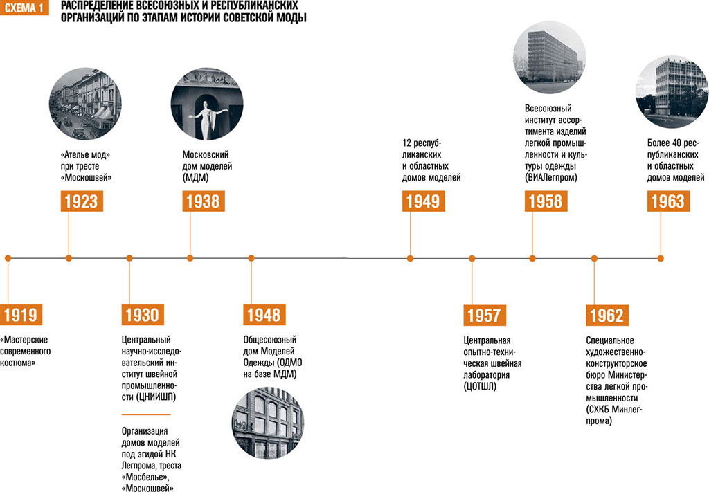 На первом этапе истории советской моды появляются и первые государственные организации, принимающие на себя ответственность за создание «массового костюма для трудящихся». В 1919 году открывается Художественная мастерская современного костюма Н. П. Ламановой при Главнауке. В 1923 году (по другим данным – в 1922-м[38]) возникает «Ателье мод» при тресте «Москвошвей»[39] – «прообраз будущего Дома моделей одежды». В 1929 году начинает выходить журнал «Швейная промышленность»[40]. С конца 1920-х моделирующие одежду организации работали при крупных швейных трестах «Мосбелье» и «Москвошвей»[41].