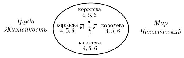 Чтобы представить этот порядок в виде синтетической схемы, надо поместить Священное Имя в центре круга, разделенного на четыре части, каждая из которых соответствует буквам yod-he-vau-he. В каждой четверти из центра круга лучами будут расходиться карты, аналогичные буквам Тетраграмматона.