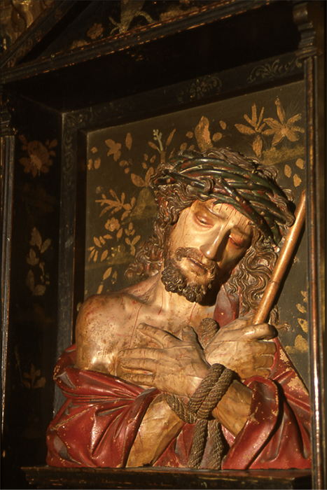Sin embargo, es en la figura completa en formato miniaturístico donde todos los recursos técnicos y expresivos alcanzan su cénit en un ejercicio primoroso de la escultura que representa un verdadero alarde en el control de la forma, que prolonga con increíble perfección las figuras de busto. Descuellan un Cristo sentado en una peña (Colección del Ayuntamiento de Granada), tipo iconográfico conocido como Cristo de la Humildad y Paciencia, que cobra todo su valor expresivo y simbólico en la contemplación de la cruz a sus pies, un Cristo arrodillado con gesto implorante (en la misma colección) que, mostrando las llagas de las manos, ofrece los meritos de su Pasión por la redención del género humano al modo del Varón de Dolores nórdico, y dos versiones del Ecce-Homo arrodillado de manos entrelazadas, una en la clausura del monasterio de Madre de Dios de religiosas dominicas en Sanlúcar de Barrameda (Cádiz) y otra recientemente identificada en la clausura del monasterio de las Descalzas Reales de Madrid[11]. En todas ellas, el preciosismo técnico atañe no solo a la definición formal de las figuras, con detalles de increíble dificultad, sino también a los “países” rocosos en las que se inserta, donde volumen y color se dan la mano para definir piedras, plantas, los clavos en algún caso, en concreta intención naturalista.