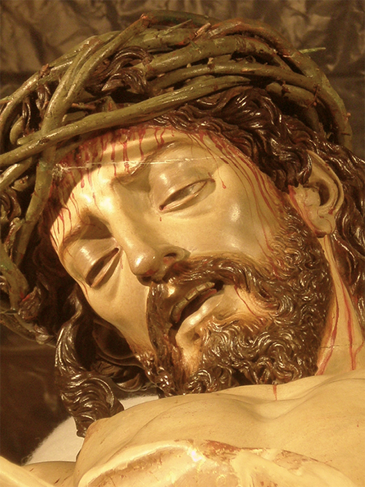 De la compacta homogeneidad iconográfica y formal de esta serie disienten otras obras que, sin embargo, cabe relacionar con fundamento a los hermanos García. Es el caso del Crucificado de la sacristía de la catedral de Granada, tradicionalmente considerado obra de Montañés hasta que Sánchez-Mesa lo atribuyó a los García en 1966, fruto de una donación en 1623[12]. Propone ya un concepto de Crucificado plenamente barroco, donde la experiencia del trabajo en barro se hace presente en la minuciosidad del modelado anatómico y la ampulosidad del paño de pureza, que genera ricos juegos de luces. Orozco señaló lo montañesina que resulta su testa (Fig. 5), lo que alimenta las hipótesis sobre la formación de estos artistas. La manera de entrelazar mechones y ramas de la corona, contando con precedentes y consecuentes —Rojas, Montañés, Mesa, Alonso de Mena— resulta un ejercicio técnico muy exigente y virtuosista, modelando de nuevo con una blandura semejante a la del trabajo del barro.