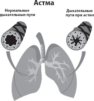 Причина астмы кроется, чаще всего, в аллергических реакциях. И, если взять микроскоп и посмотреть кусочек бронхов с астмой, мы увидим клетки аллергического воспаления. Эозинофилы вместе с другими клетками будут встречаться во всех слоях бронхов. Эти клетки, а также многие другие, вырабатывают вещества, которые, в процессе аллергических реакций, освобождаются и приводят к бронхоспазмам. Слизистая отекает, идет продукция мокроты. И все это в комплексе затрудняет дыхание.