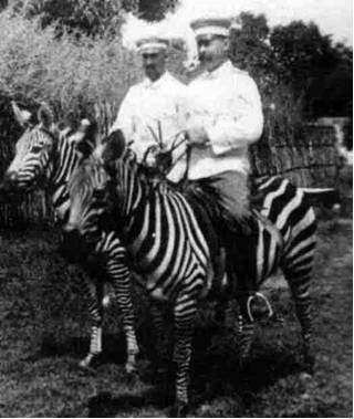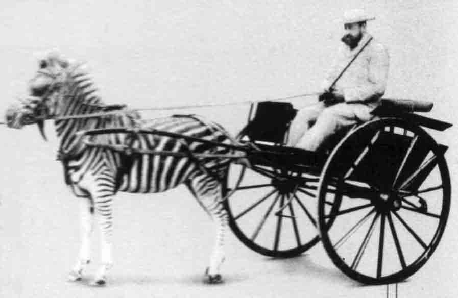 Ротшильдовские экипажи «на полосатой тяге» – наиболее серьезные попытки использования полуодомашненных зебр в рабочей упряжке. Однако при езде четверней или шестерней в качестве левого переднего «двигателя» (самого проблемного при управлении, если всадник – правша: это животное труднее всего подстегнуть кнутом, так что оно должно лучше прочих слушаться поводьев) все-таки использовалась «традиционная» лошадь…