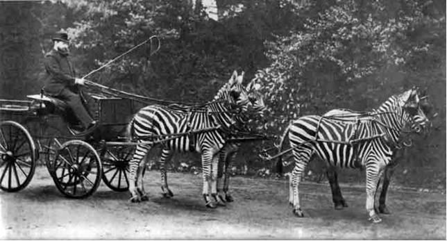 Зебра Бурчелла в прогулочном экипаже (викторианская Англия). На «водительском сидении» – 2-й барон Ротшильд, Лайонел Уолтер: не только финансист и политик, но также известный биолог